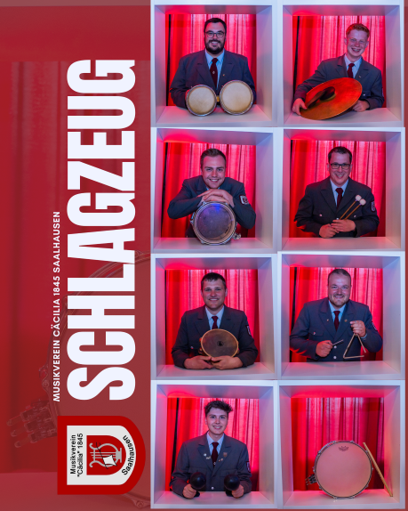 Zum Grundstock zählt man die Pauken, die große Trommel, die Konzerttrommel, Becken und die Triangel. Da sich das Spektrum über die Jahre stetig erweitert und an die unterschiedlichsten Musikarten angepasst hat, bedient unser rein männliches Register heute auch Instrumente wie das Drumset, Stabspiele und die verschiedensten Effektinstrumente.